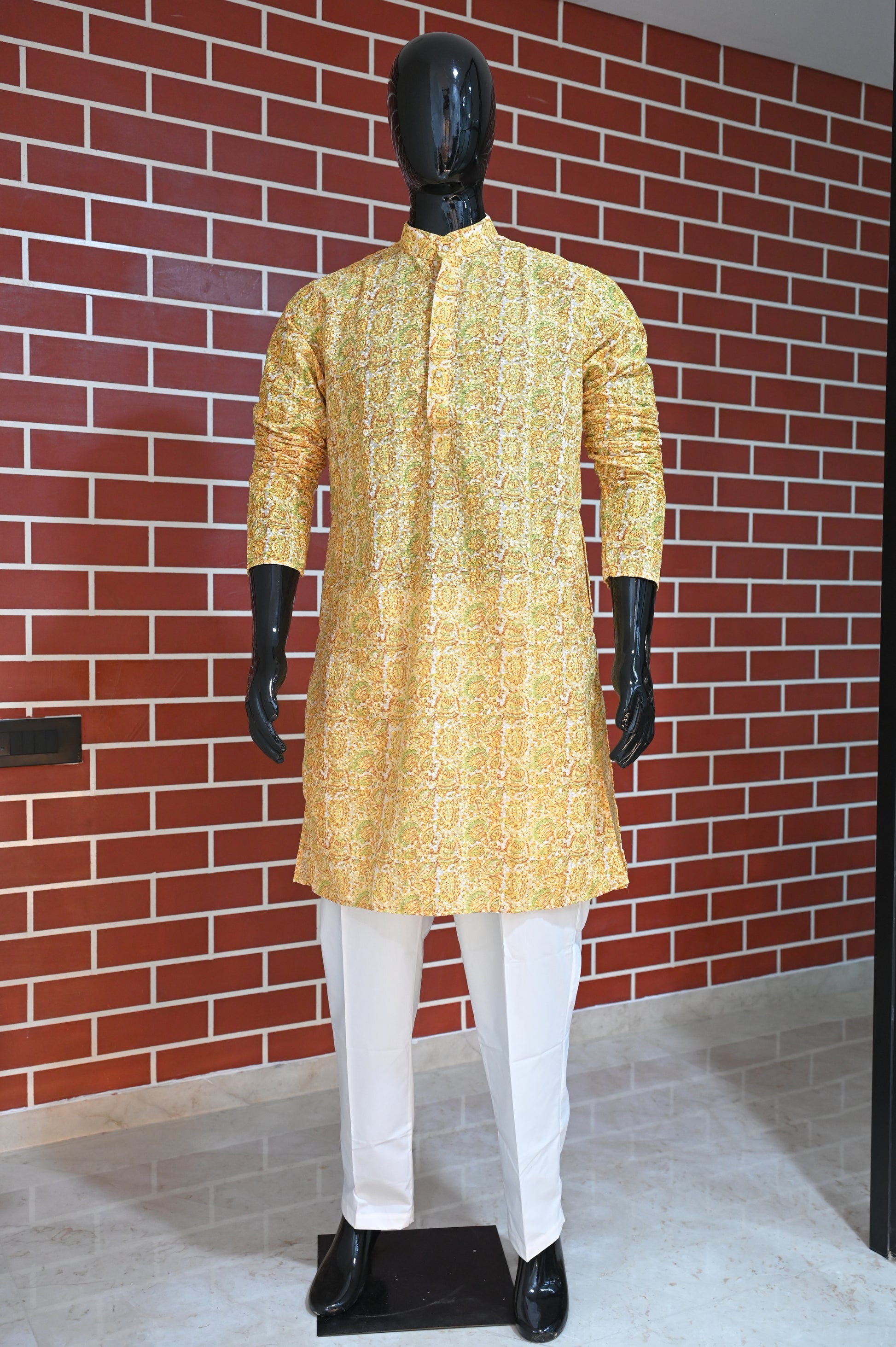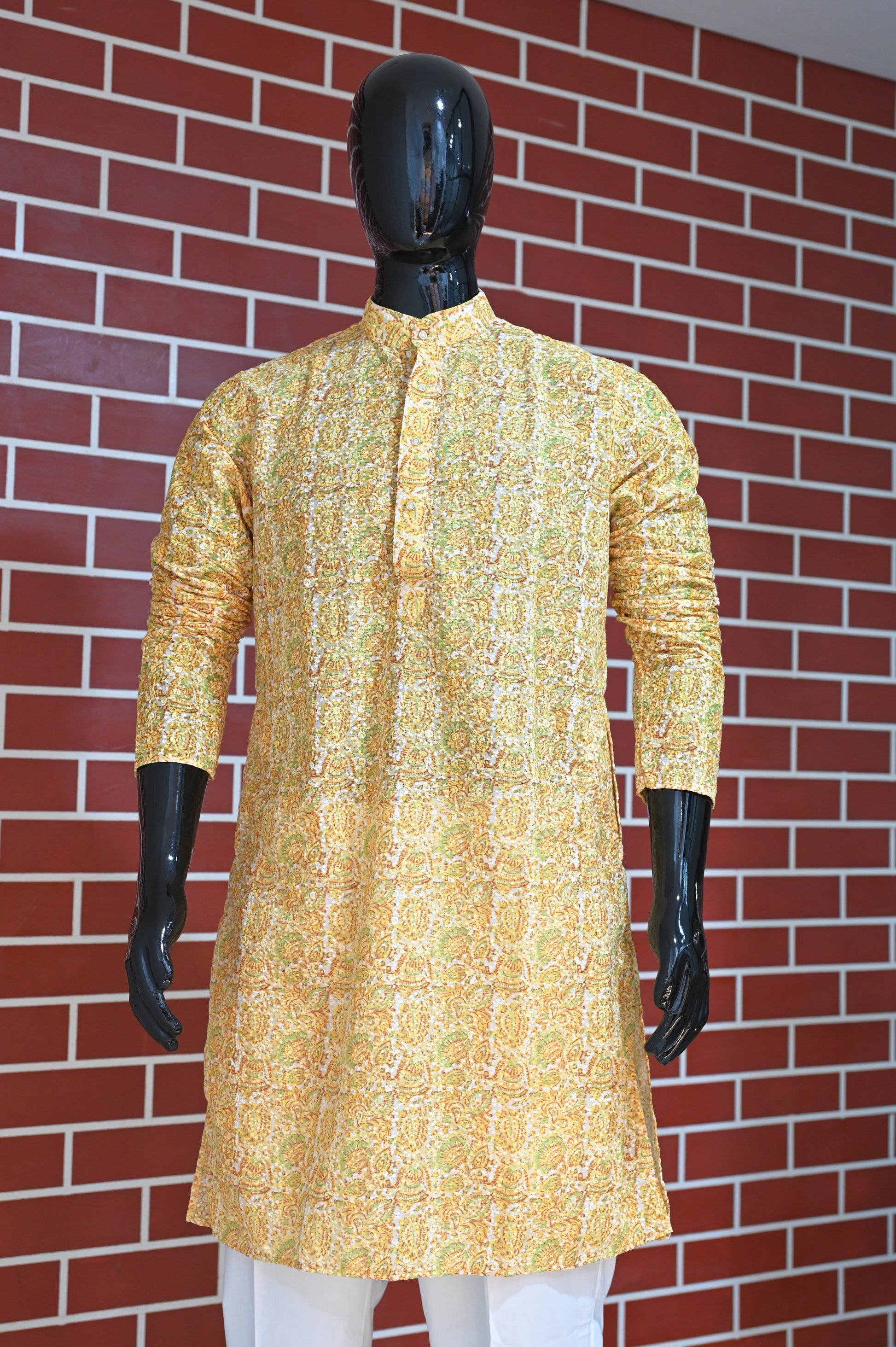 This Rajwadi kurta features stunning floral embroidery and a vibrant yellow color, perfect for any occasion. Made with meticulous attention to detail, this kurta is sure to make a statement and elevate your style. Expertly crafted and designed for comfort, this kurta is a must-have for any fashion-forward man.